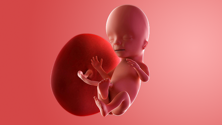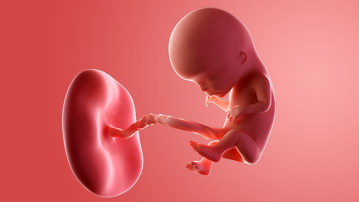 Composite. One side shows a foetus attached to the placenta by the umbilical cord. The foetus is recognisable as a baby. Other side shows a person holding a peach in one hand.
