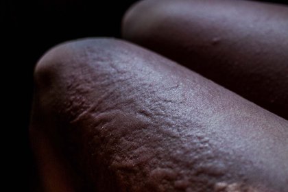 The skin on most of their thigh is pink, raised and bumpy. At the side of their thigh, close to their hand, are deep creases in the skin.