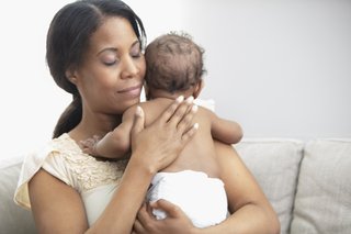 With your baby's chin resting on your shoulder, support the head and shoulder area with one hand, and gently rub and pat your baby's back.