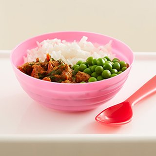 Serve ¼ of the curry in a bowl with a spoon or fork, with the rice and the cooked peas on the side as a finger food.