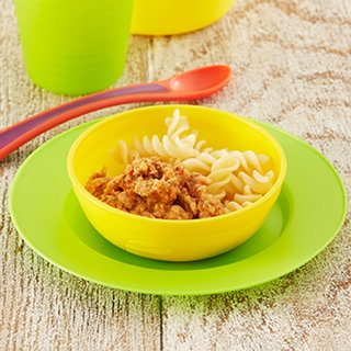 Place ¼ of the ratatouille in a bowl and serve with the cooked pasta (either as a finger food, or mashed with the fish and vegetables).