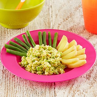 Your baby will love feeding themselves these little pots of cheesy veg omelettes, served with potatoes and green beans.
