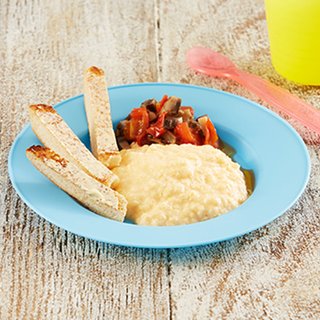 Encourage your baby to pick up the muffin strips and mushrooms themselves to practise self-feeding.