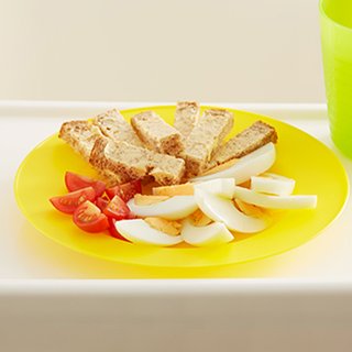 Serve the toast, egg fingers and tomatoes on a plate and encourage your baby to feed themselves.