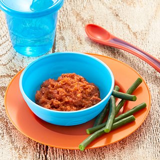 4. Once cooled a little, blend or mash the goulash until smooth (but with soft lumps). Serve with the green beans as a finger food.