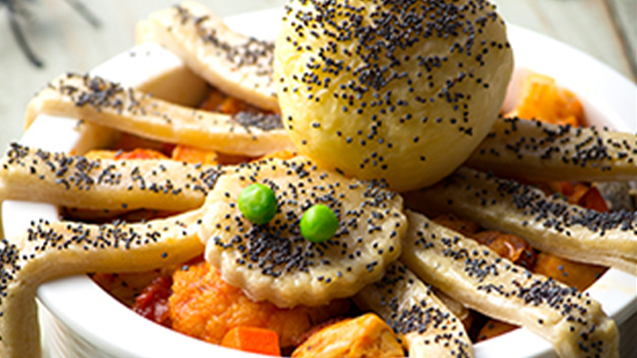This fun and easy recipe makes a sort of simple pizza – but with a few twists it becomes a spooky Halloween treat!